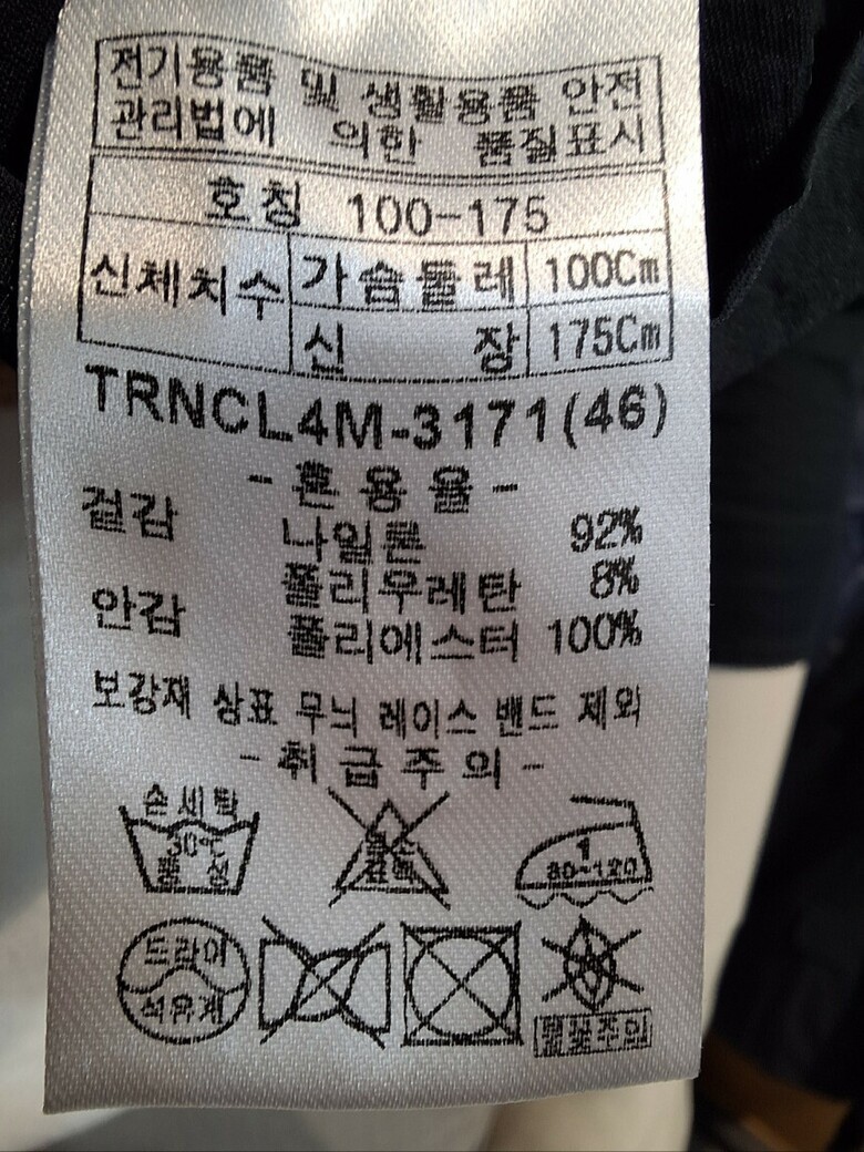 | 1. 제품 소재 (섬유의 조성 또는 혼용률을 백분율로 표시, 기능성인 경우 성적서 또는 허가서) | 겉감:나일론 92%, 폴리우레탄 8% / 안감:폴리에스테르 100%, 폴리우 |