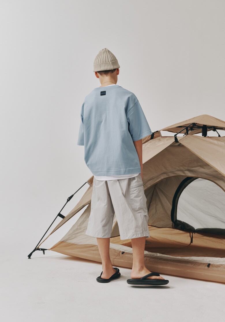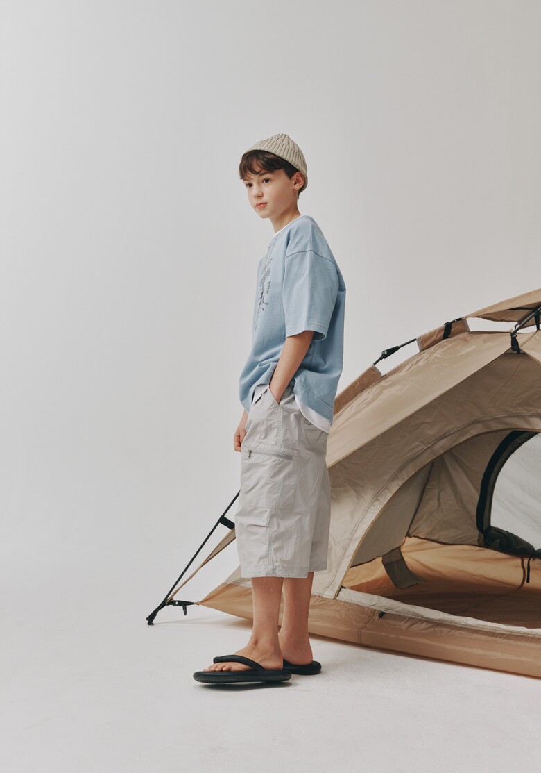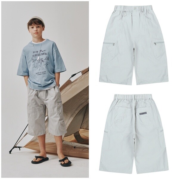 라이트그레이 컬러의 화섬으로 제안한 통고무줄 7부 팬츠입니다.