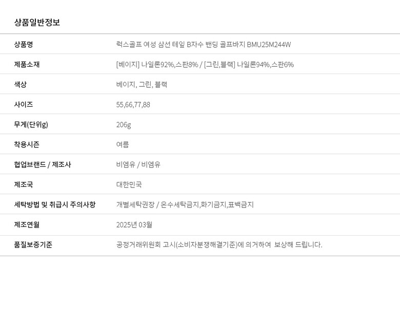 골피아 BMU25M244W 여성 삼선 테잎 B자수 밴딩 골프바지