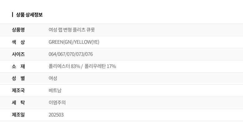 | 1. 제품 소재 (섬유의 조성 또는 혼용률을 백분율로 표시, 기능성인 경우 성적서 또는 허가서) | 폴리에스터 83% / 폴리우레탄 17% |