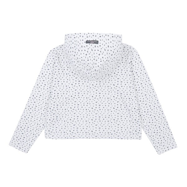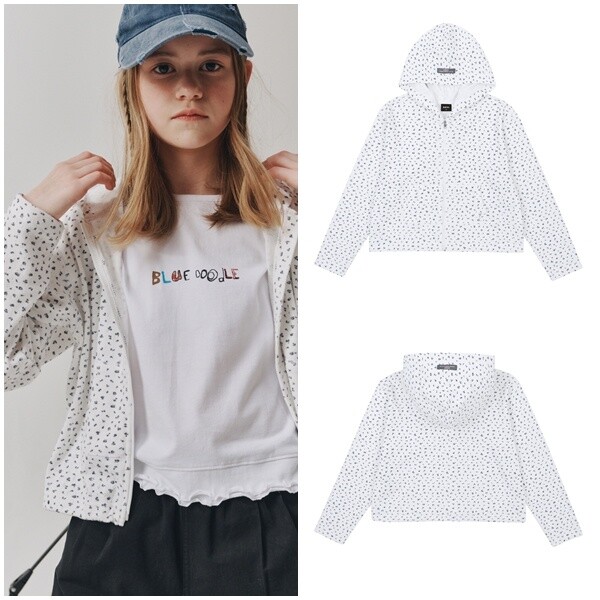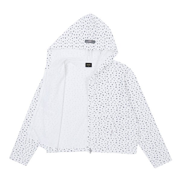 클린한 화이트 컬러로 제안한 플라워 프린팅 후드집업입니다. 살짝 넉넉한 상동에 크롭한 기장으로 제안하였습니다.