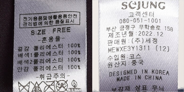| 2. 소재 | 겉감:폴리에스터100% 안감:폴리에스터100% 배색1:폴리에스터100% 배색2:폴리에스터100% |