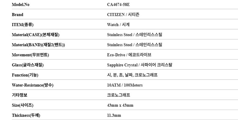 7. 주요 사양 스테인리스스틸 시계 에코드라이브