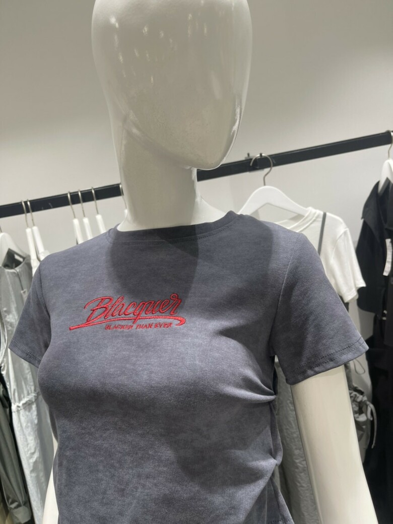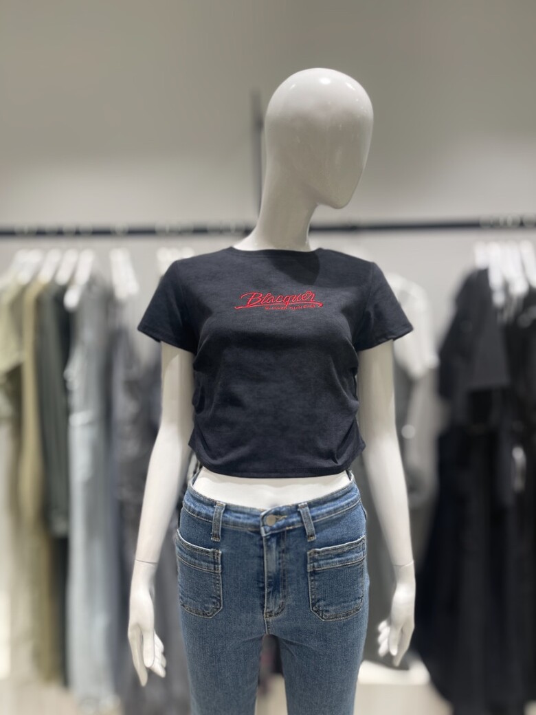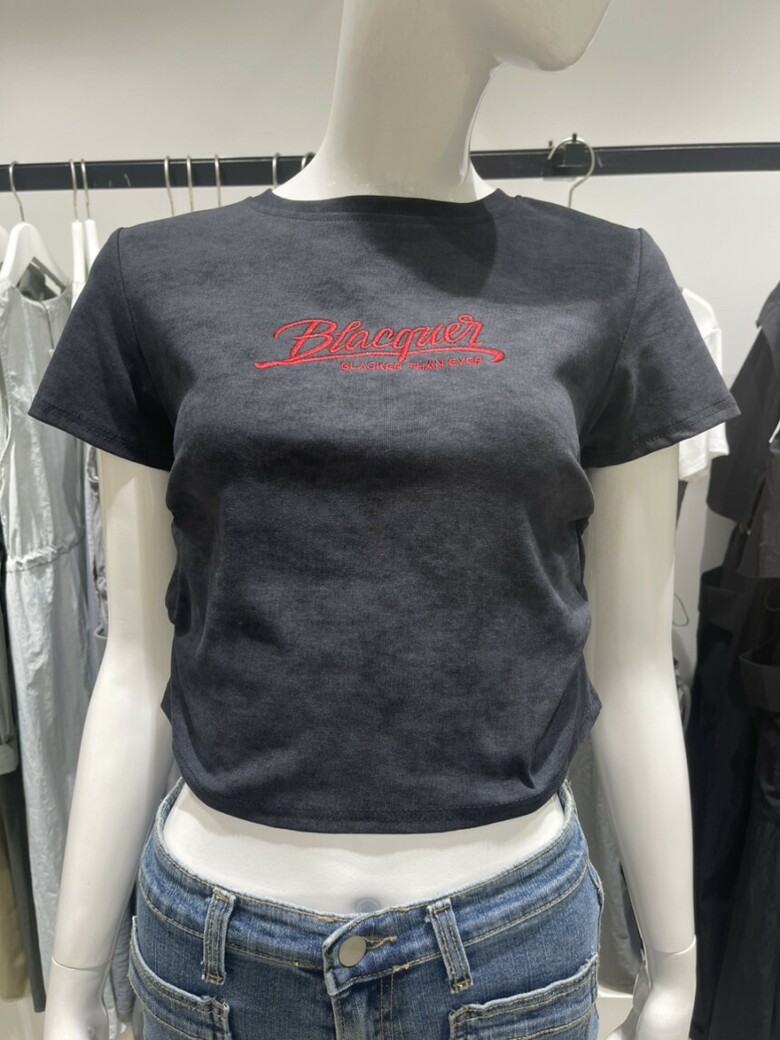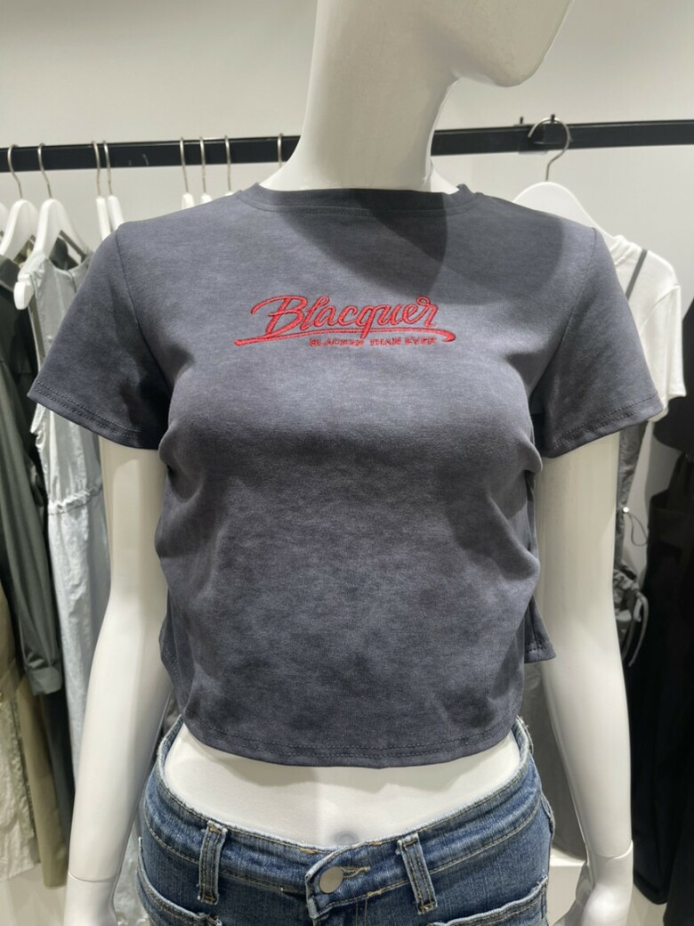 레드컬러의 영문자수 디테일과 나염디테일로 세련된 느낌이 돋보이는 크롭기장감의 라운드넥 티셔츠 입니다