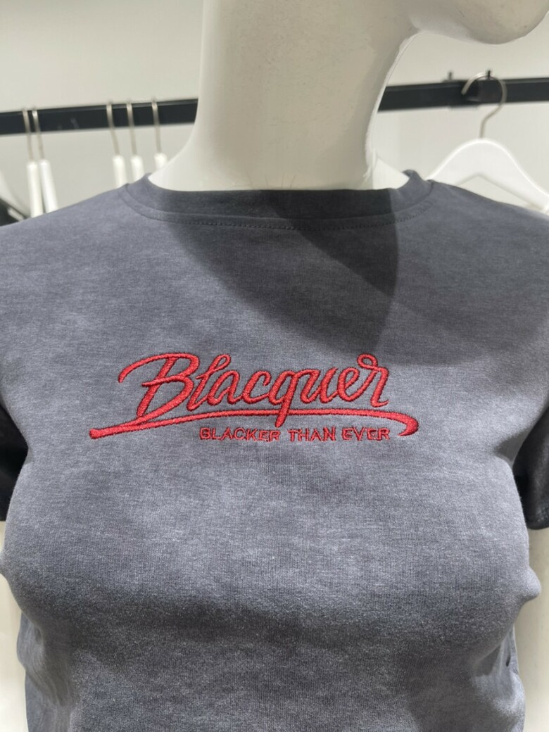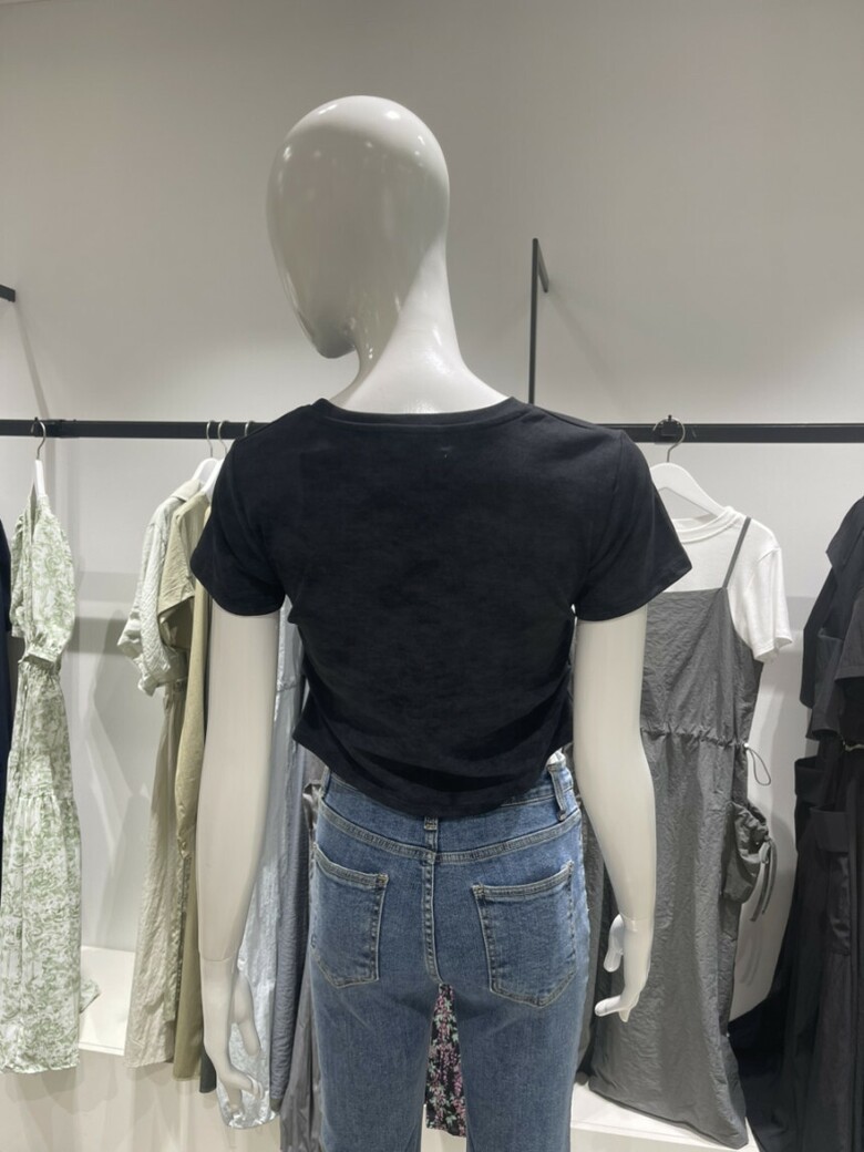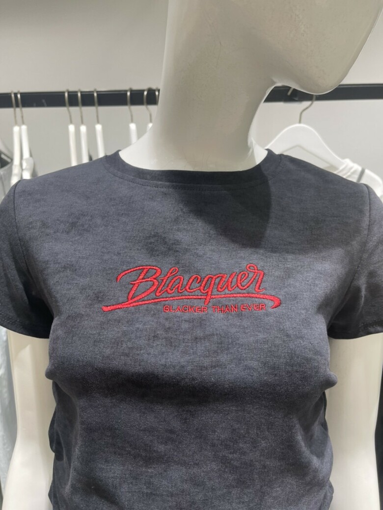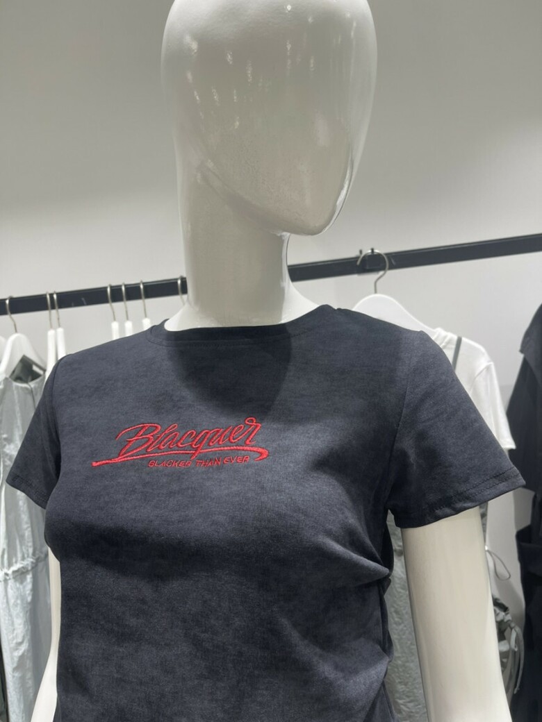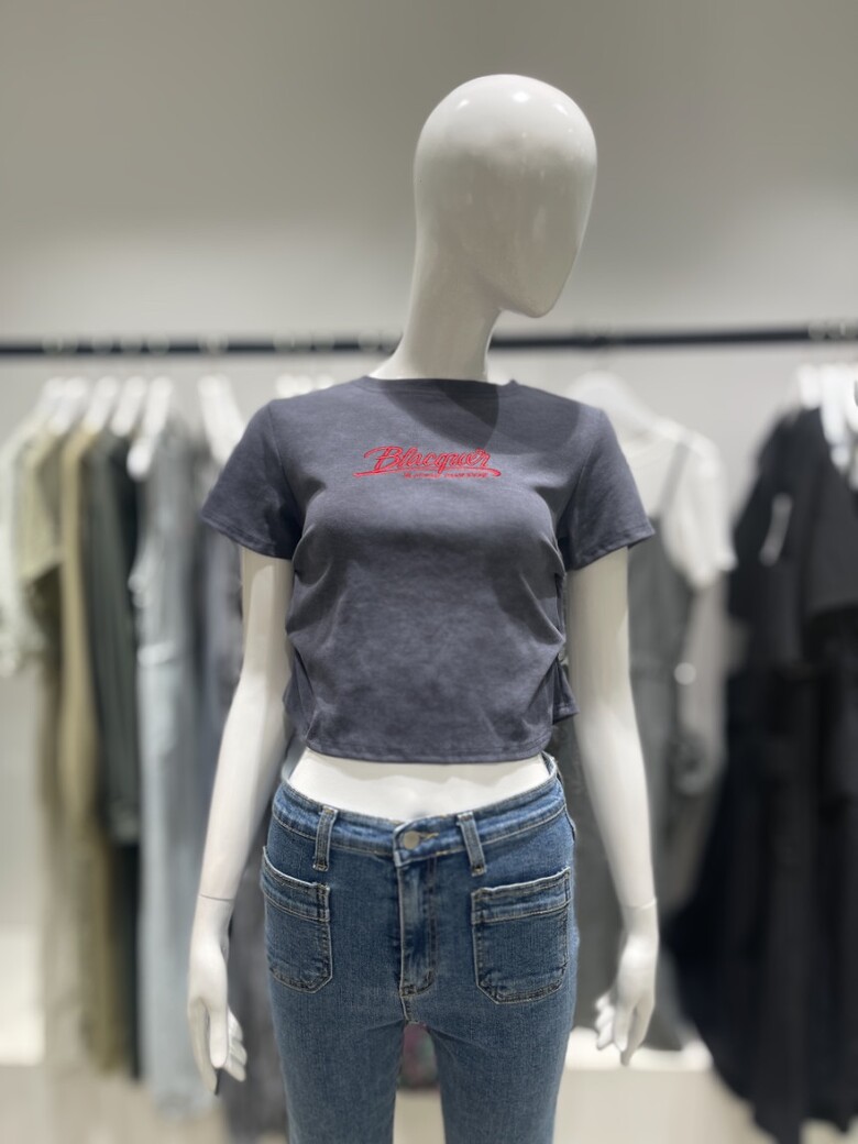 레드컬러의 영문자수 디테일과 나염디테일로 세련된 느낌이 돋보이는 크롭기장감의 라운드넥 티셔츠 입니다