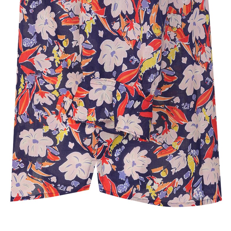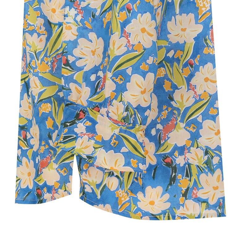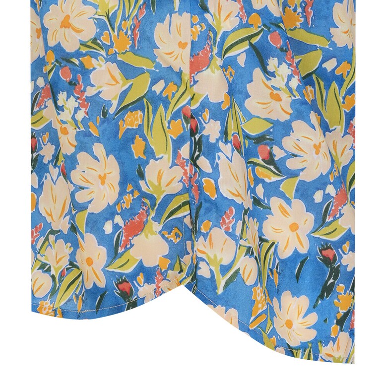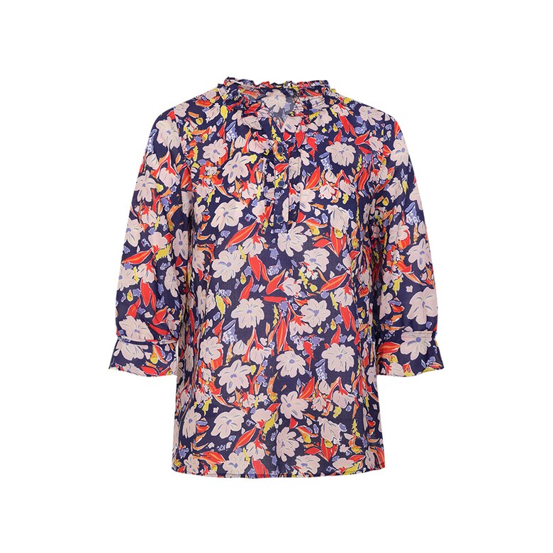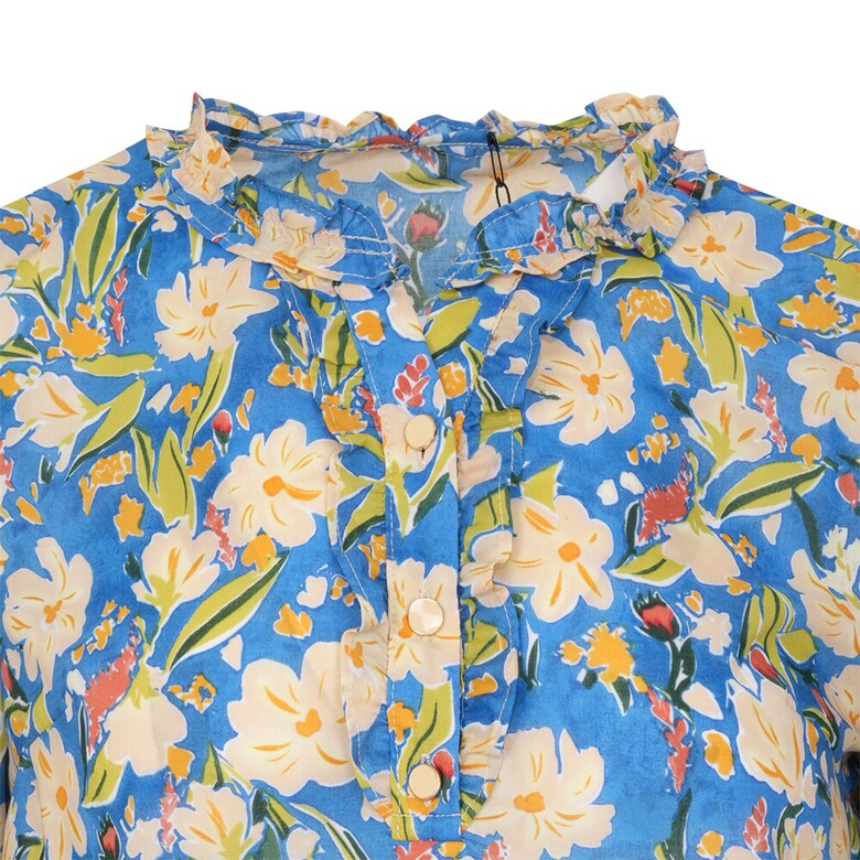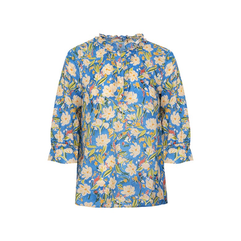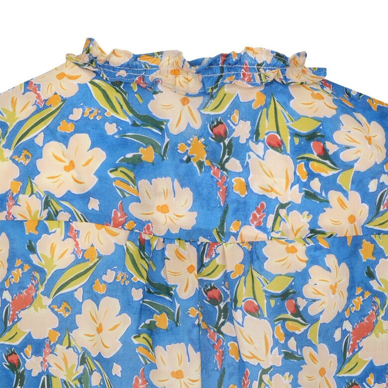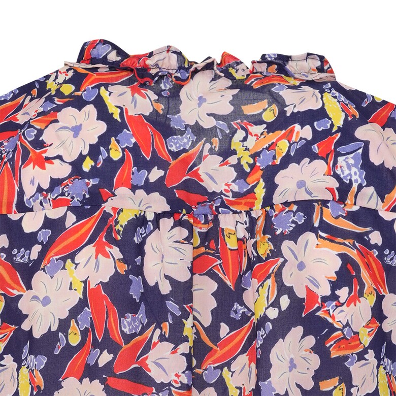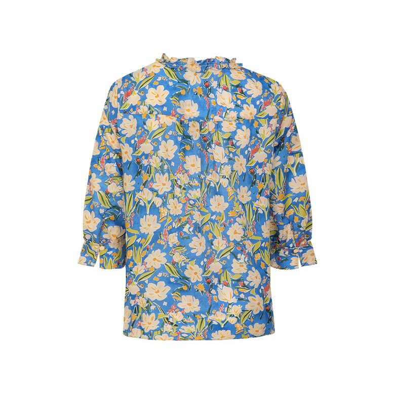 플라워 프린트의 면 아사 블라우스입니다. 넥과 하프 플라켓의 러플과 소매의 러플 디테일로 여성스러움을 더하였습니다.