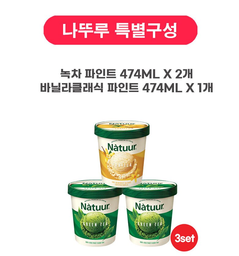 [나뚜루] 파인트 474ml 3개 세트 (녹차 2+바닐라 1)