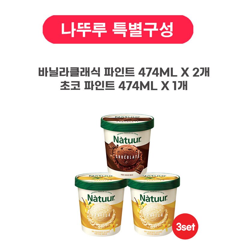 [나뚜루] 파인트 474ml 3개 세트 (바닐라 2+초코 1)