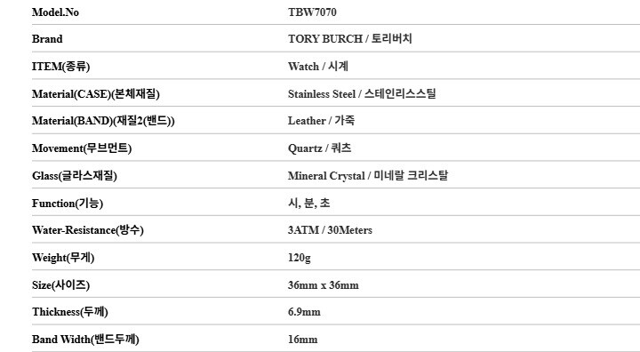7. 주요 사양 스테인리스스틸 시계 쿼츠