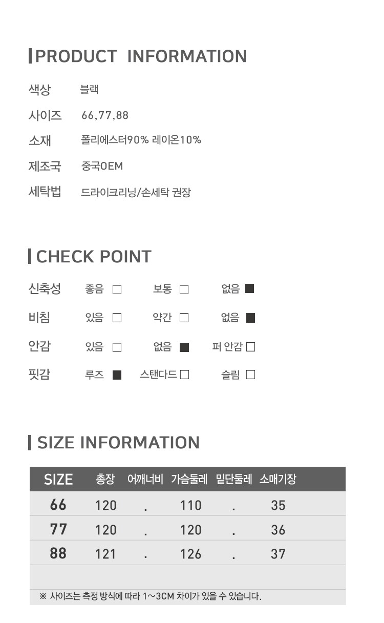 • 처음 배송된 상품상태와 다를 경우(세탁/착용 후 외출하신 경우) 반품이 불가합니다.