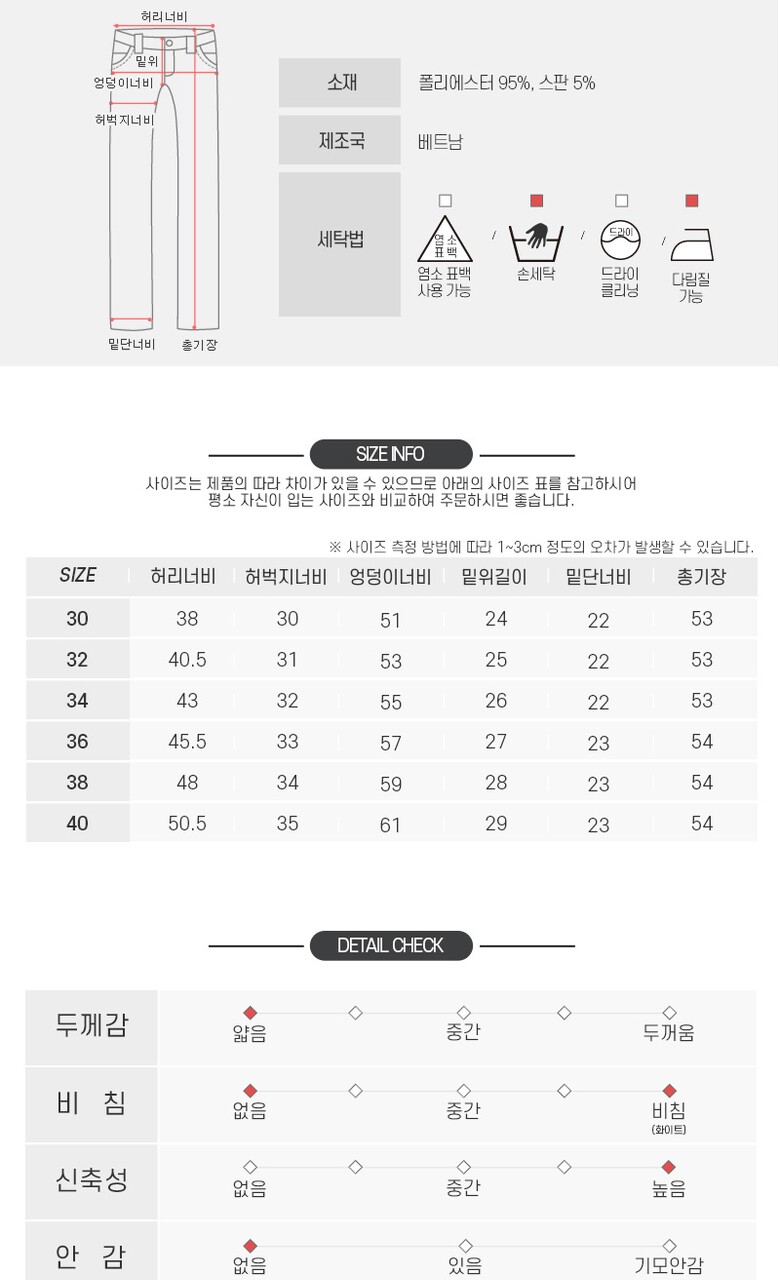 3. 치수 | 30,32,34,36,38,40 |