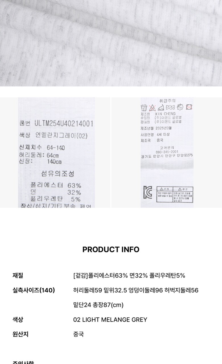 제품소재 : [겉감]폴리에스터63%, 면32%, 폴리우레탄5%