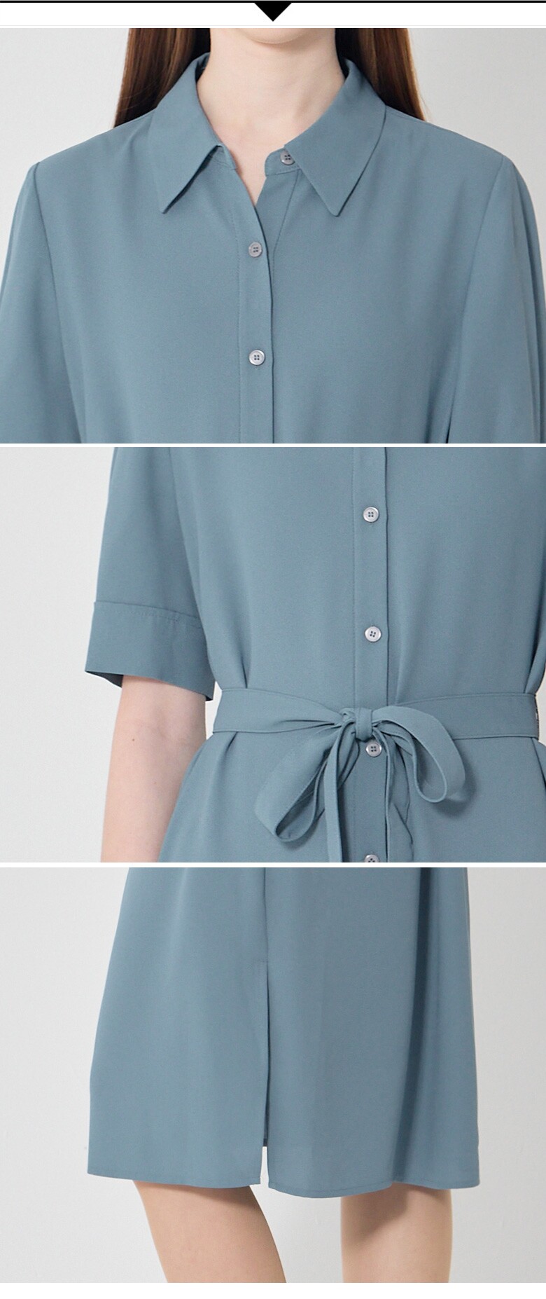 단정한 셔츠 디자인의 원피스로 하나만으로도 스타일리시한 룩이 완성됩니다.