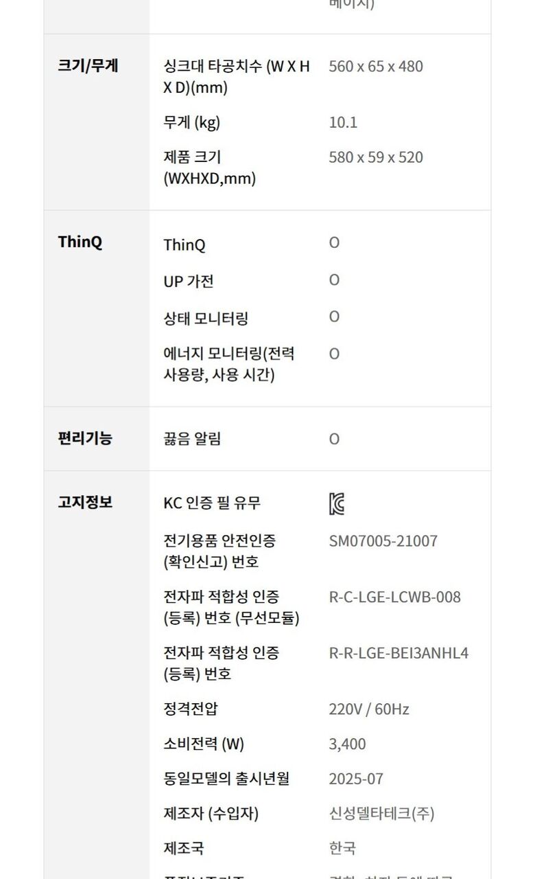 7. 정격전압,소비전력 | 220V / 60Hz, 3,400W, 1등급 |