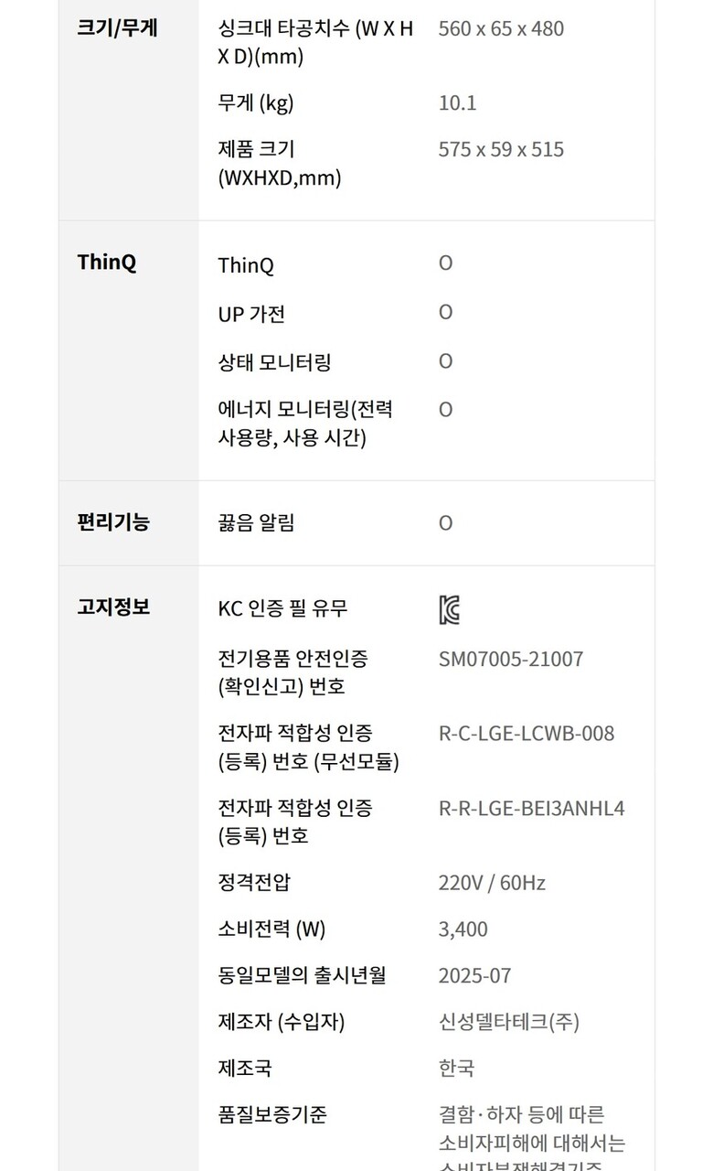 7. 정격전압,소비전력 | 220V / 60Hz, 3,400W, 1등급 |