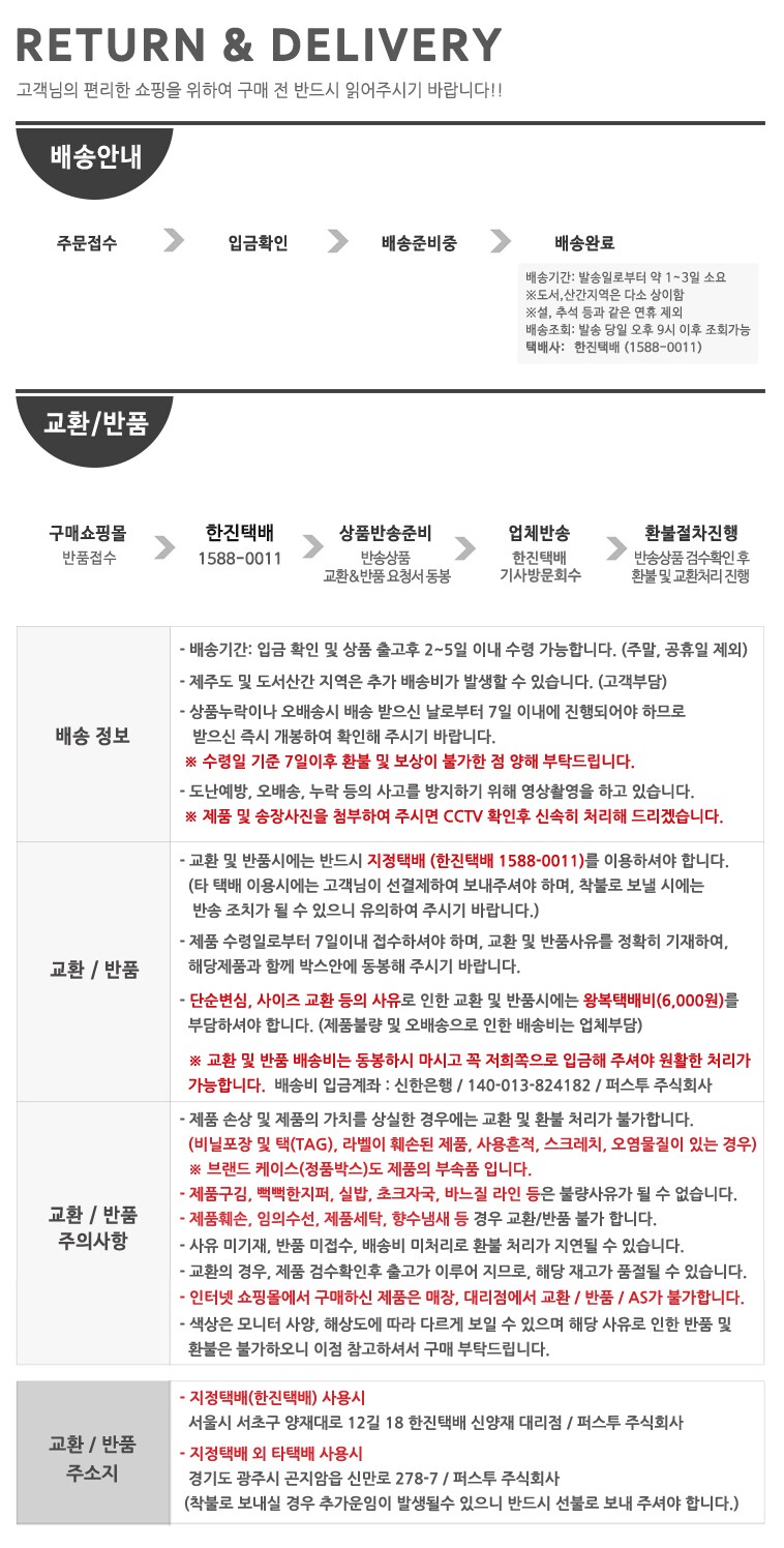 상품불량에 의한 반품, A/S, 품질보증 및 피해보상 등에 관한 사항은 소비자 분쟁해결기준(공정거래위원회 고시) 구매자가 미성년자인 경우에는 상품 구입시 법정대리인이 동의하지 아니하면 미성년자 본인 또는 법정대리인이 구매취소 할 수 있습니다. |