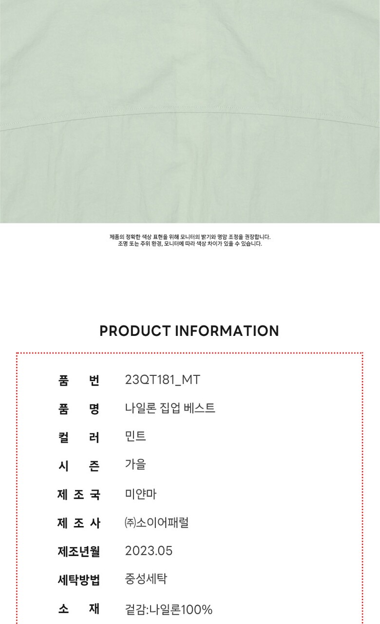 1. 제품 소재 (섬유의 조성 또는 혼용률을 백분율로 표시, 기능성인 경우 성적서 또는 허가서) | 겉감:나일론100% |