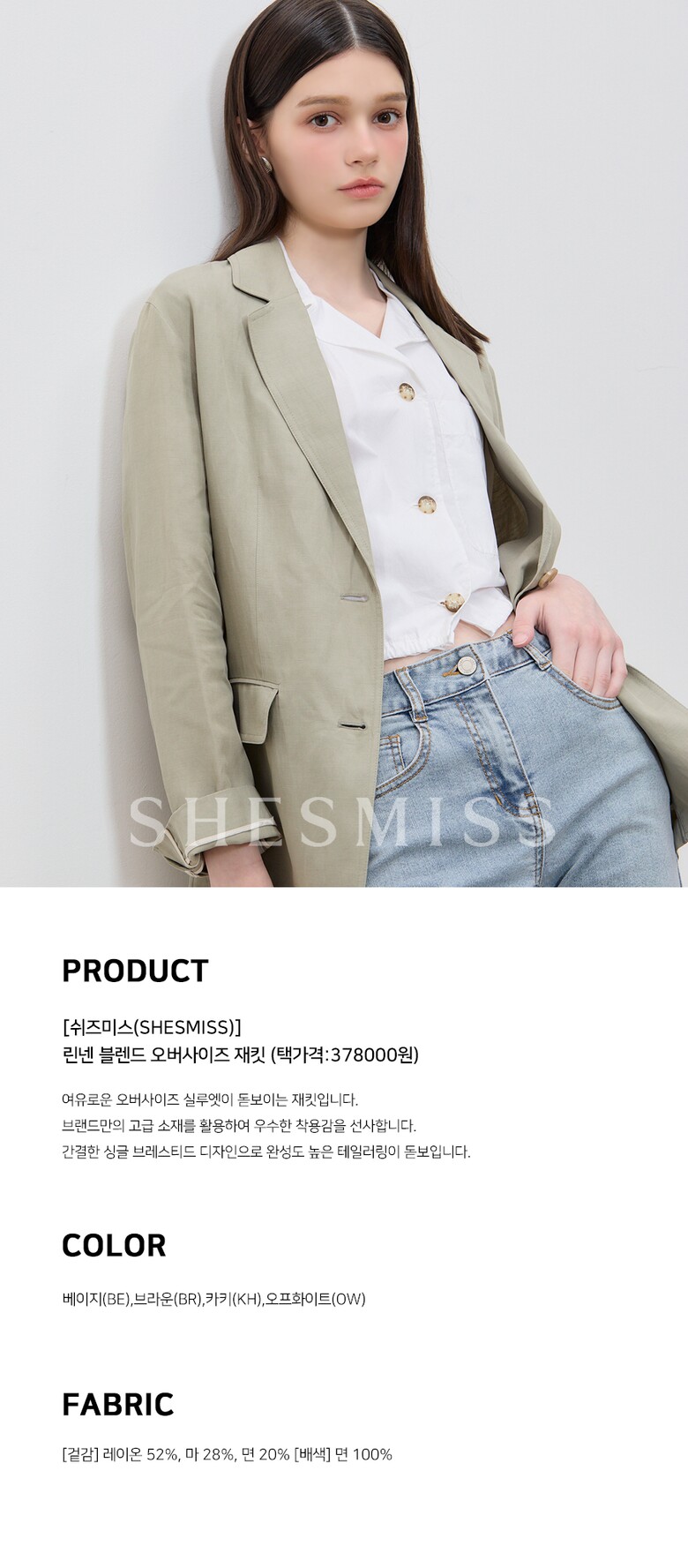 [쉬즈미스(SHESMISS)] 린넨 블렌디드 보이핏 오버사이즈 재킷 (택가격: 378000원)
