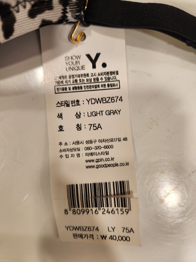 | 1. 제품 소재 (섬유의 조성 또는 혼용률을 백분율로 표시, 기능성인 경우 성적서 또는 허가서) | 브라 : 편물(니트)/솔리드/폴리스판 겉감1 / PE:90%, PU:10%, 안감2 / CO:100% 팬티 : 편물(니트)/나염/폴리스판 겉감1 / PE:90%, PU:10%, 겉감2 / NY:73%, PU:27%, 안감1 / CO:100% |