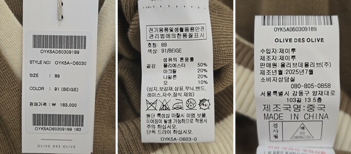 겉감 : 폴리에스터50%아크릴20%나일론20%모10%