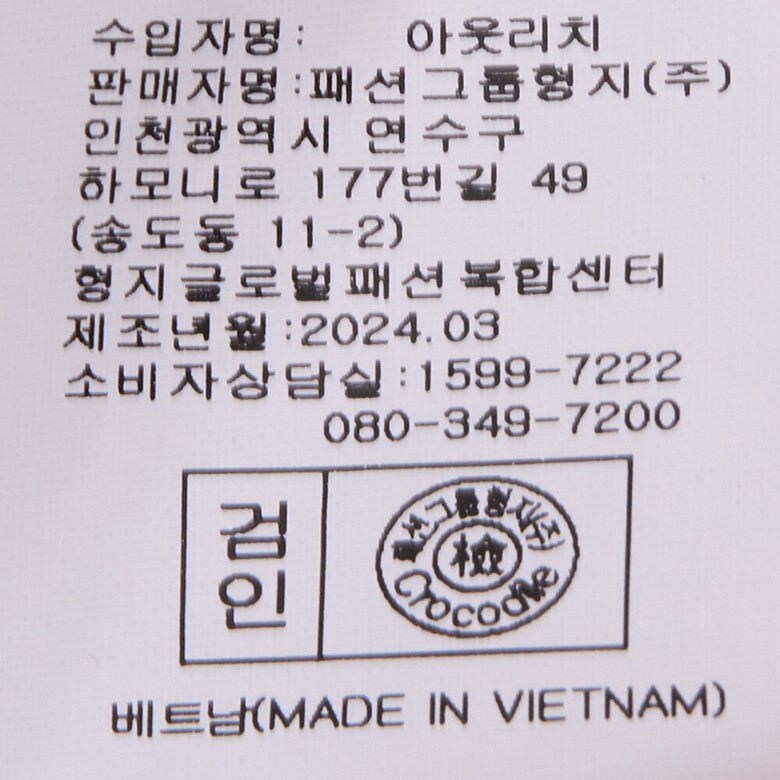 • 아울렛 상품의 특성 상 “택이 훼손”된 경우가 있으나 이는 불량이 아니며 무료 반품 대상 상품이 아닙니다.