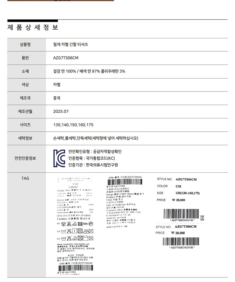1. 제품 소재 (섬유의 조성 또는 혼용률을 백분율로 표시, 기능성인 경우 성적서 또는 허가서) 겉감 면 100% / 배색 면 97% 폴리우레탄 3%