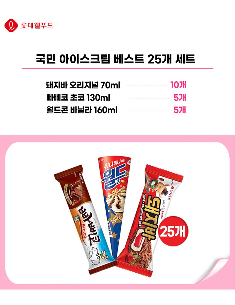 [롯데] 국민 아이스크림 베스트 25개 세트(월드콘 5,돼지바 15, 빠삐코 5)