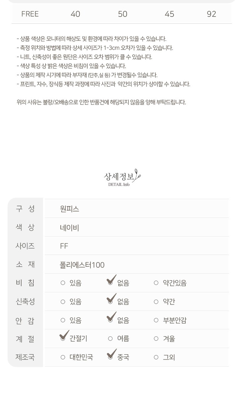 1. 제품 소재 (섬유의 조성 또는 혼용률을 백분율로 표시, 기능성인 경우 성적서 또는 허가서) 상세페이지 참조