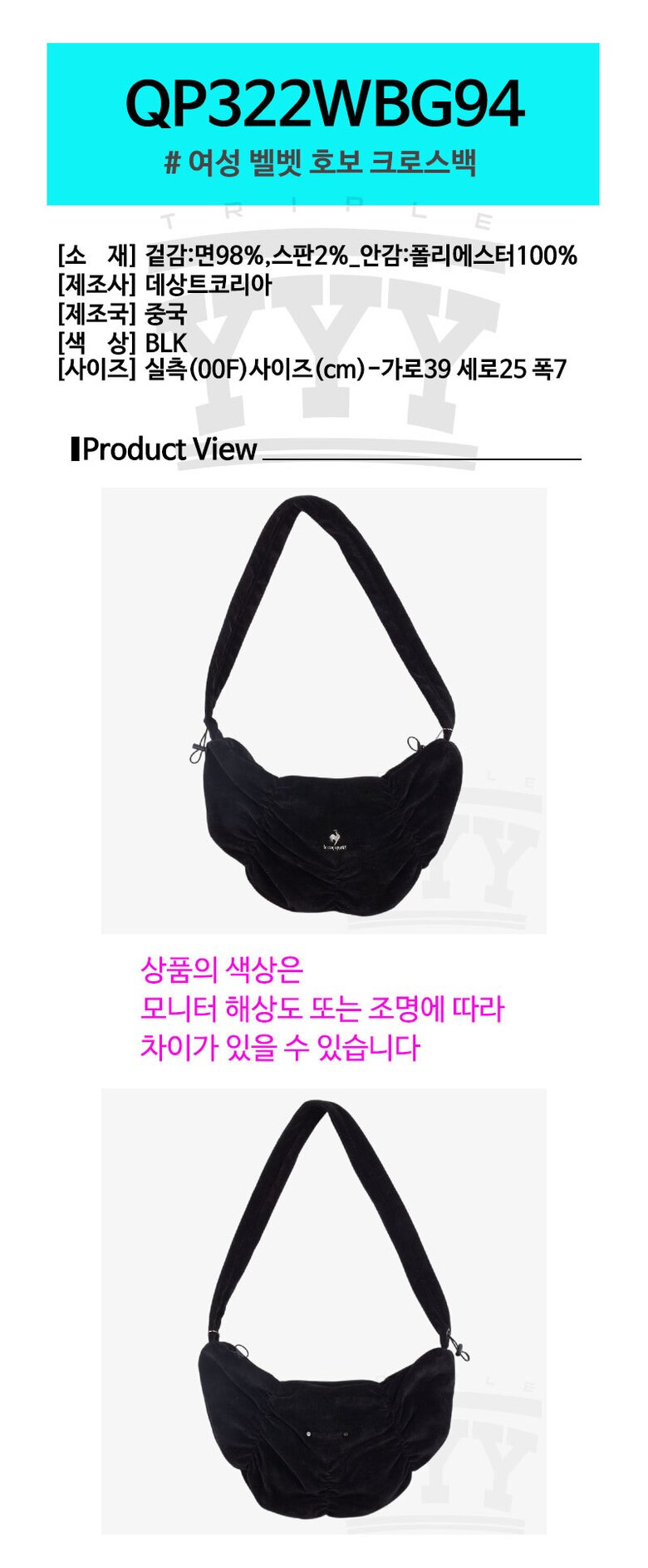 르꼬끄 여성 벨벳 호보 크로스백 QP322WBG94 BLK
