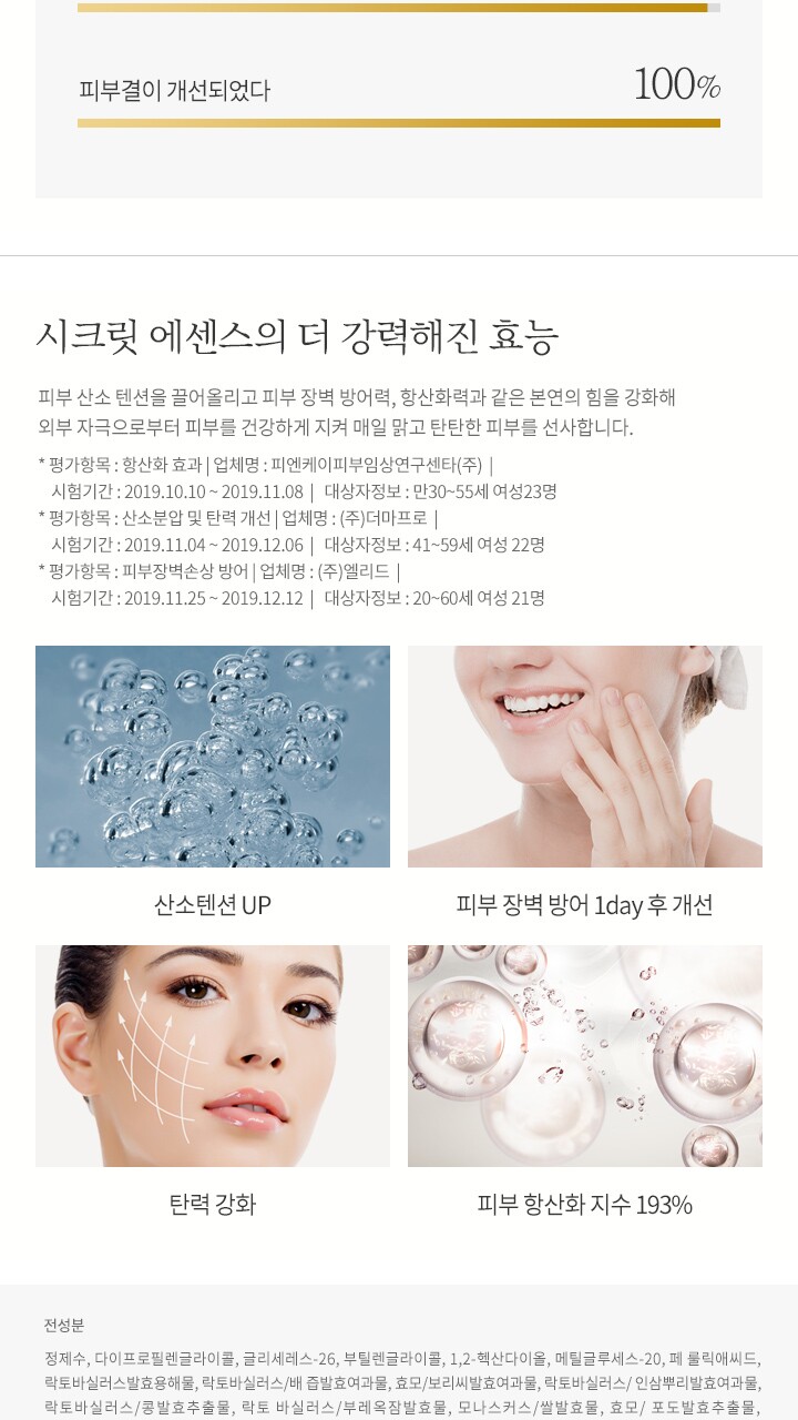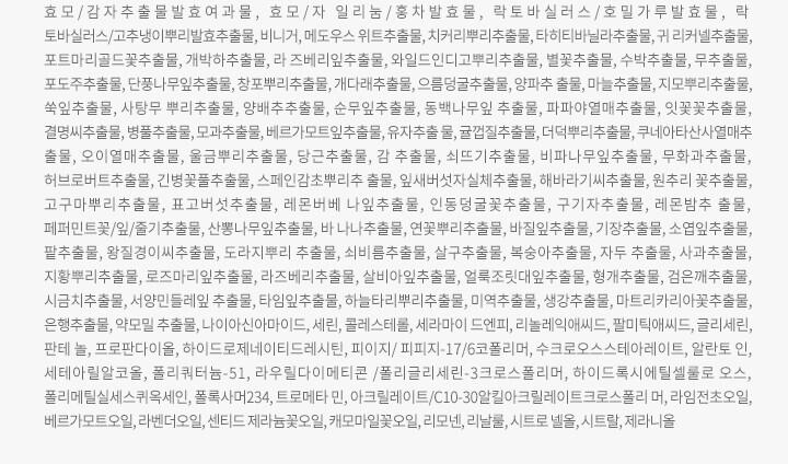 7. 주요성분 | 정제수, 프로판디올, 스쿠알란, 백화사설초추출물, 디메치콘, 부틸렌글라이콜, 감초추출물, 메도우폼씨오일, 글리세린, 작약추출물, 연꽃추출물, 옥죽추출물, 마돈나백합비늘줄기추출물, 지황추출물, 꿀, 녹차추출물, 인삼추출물, 하이드롤라이즈드인삼사포닌, 뽕나무뿌리추출물, 쉐어버터, 1, 2-헥산디올, C12-20알킬글루코사이드, C14-22알코올, 글리세릴스테아레이트, 글리세릴카프릴레이트, 라우릭애씨드, 메톡시피이지-114/폴리엡실론카프롤락톤, 미리스틱애씨드, 베헤닐알코올, 스테아릭애씨드, 아라키딜글루코사이드, 아라키딜알코올, 에칠헥실글리세린, 잔탄검, 카보머, 카프릴릴글라이콜, 트로메타민, 팔미틱애씨드, 하이드로제네이티드레시틴, 디소듐이디티에이, 페녹시에탄올, 향료, 제라니올, 시트랄, 리날룰, 시트로넬올, 리모넨 확인 |
