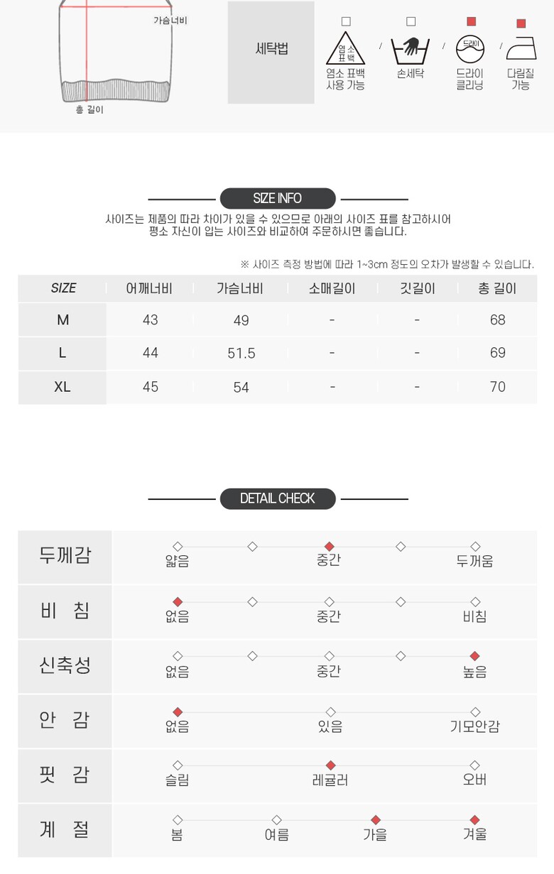 • 처음 배송된 상품상태와 다를 경우(세탁/착용 후 외출하신 경우) 반품이 불가합니다.