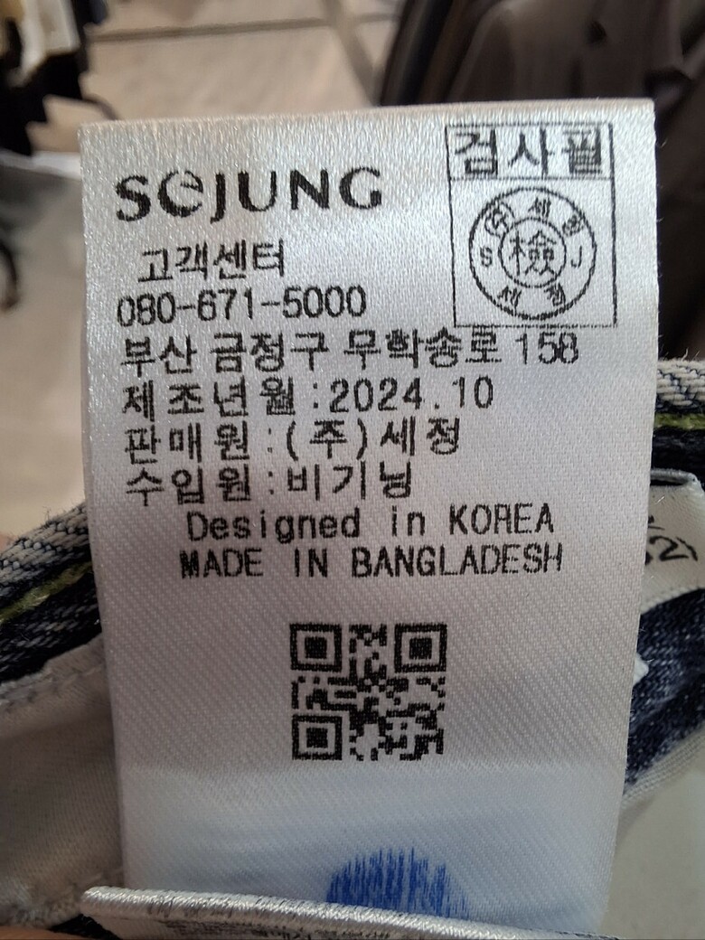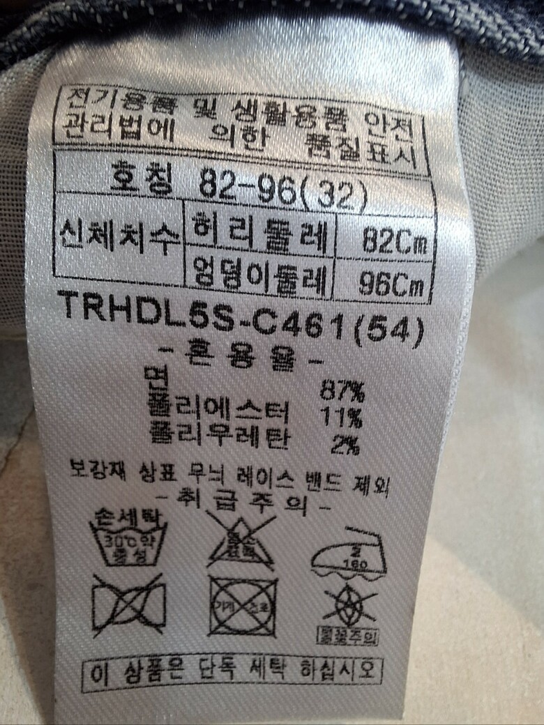 | 1. 제품 소재 (섬유의 조성 또는 혼용률을 백분율로 표시, 기능성인 경우 성적서 또는 허가서) | 데님, 면 87%, 폴리에스테르 11%, 폴리우레탄 2% |