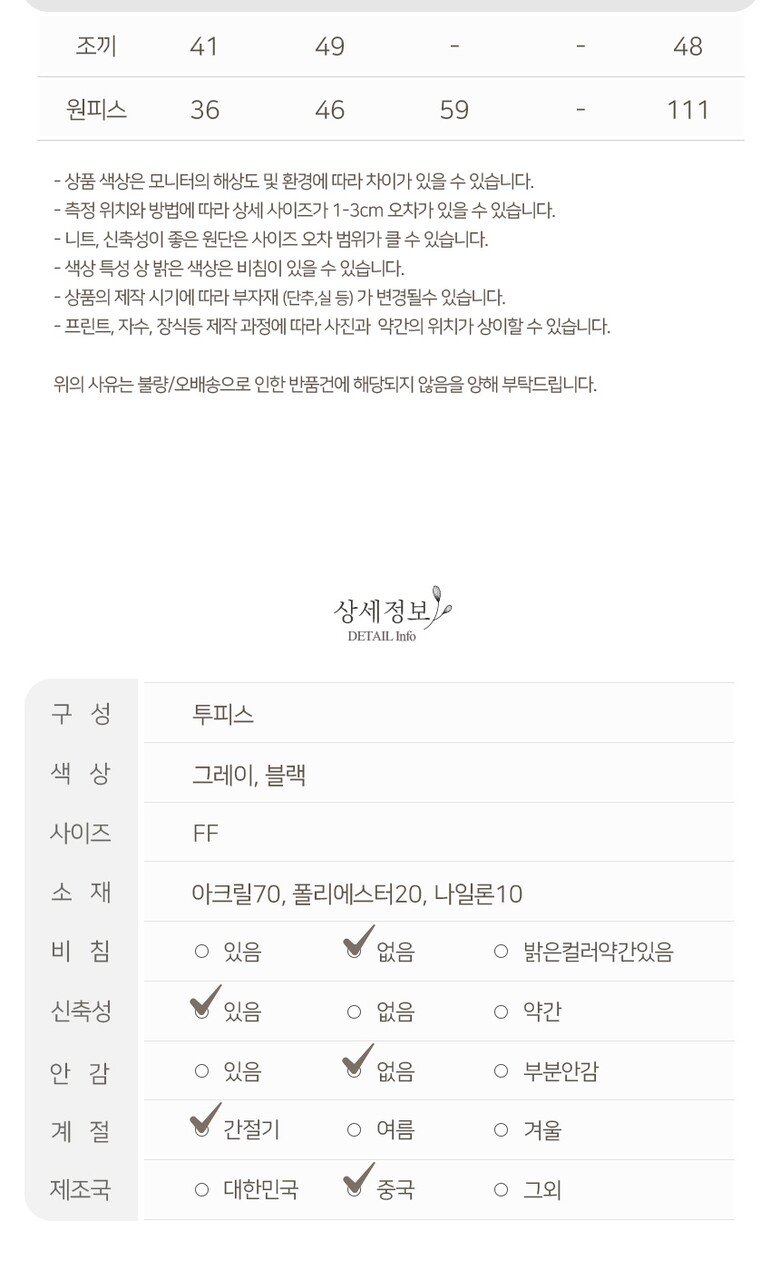 1. 제품 소재 (섬유의 조성 또는 혼용률을 백분율로 표시, 기능성인 경우 성적서 또는 허가서) | 상세페이지 참조 |