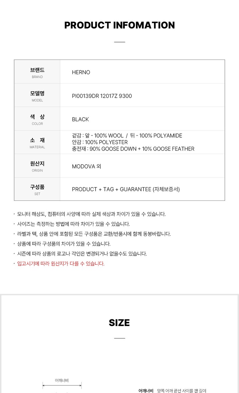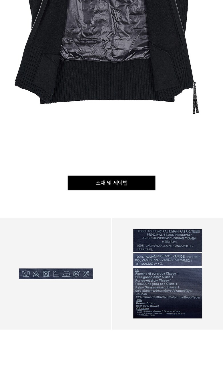 1. 제품 소재 (섬유의 조성 또는 혼용률을 백분율로 표시, 기능성인 경우 성적서 또는 허가서) | 겉감 : 앞 - 울 100% / 뒤 : 폴리아미드 100% / 안감 : 폴리에스터 100% / 충전재 : 구스다운 90% + 구스페더 10% |
