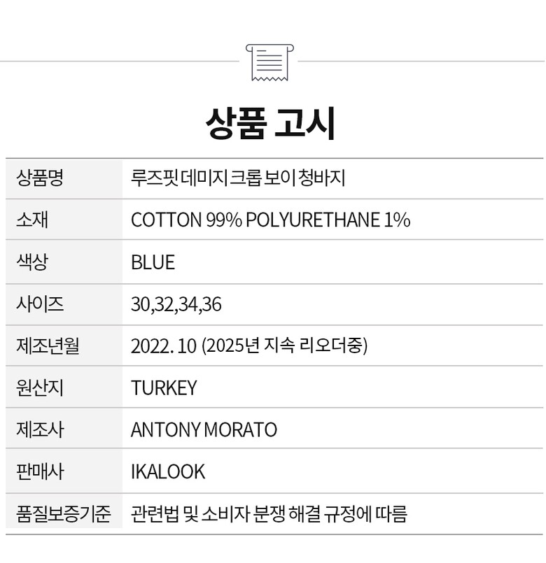 1. 제품 소재 (섬유의 조성 또는 혼용률을 백분율로 표시, 기능성인 경우 성적서 또는 허가서) | 상세페이지 참고 |