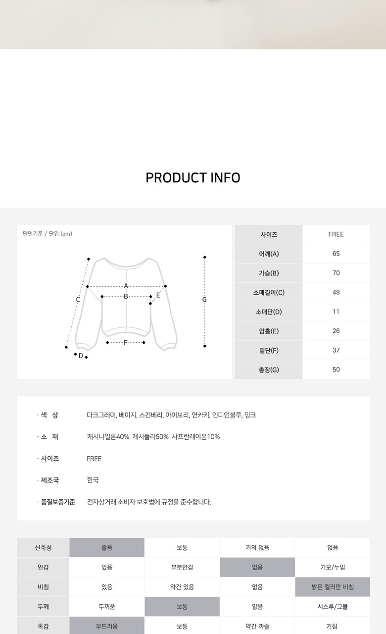 1. 제품 소재 (섬유의 조성 또는 혼용률을 백분율로 표시, 기능성인 경우 성적서 또는 허가서) | 상세페이지 기재 |