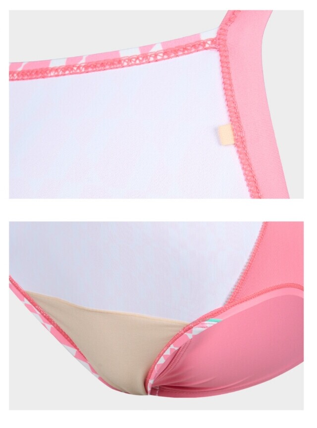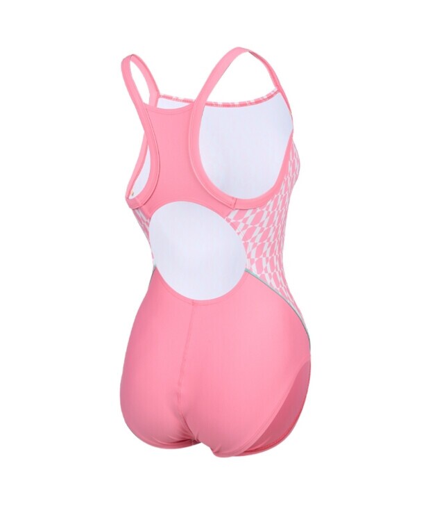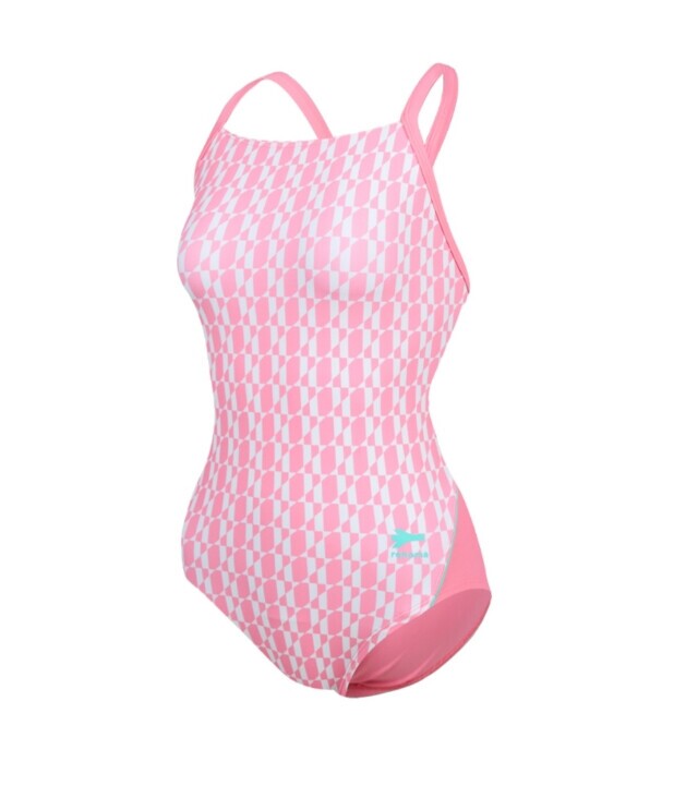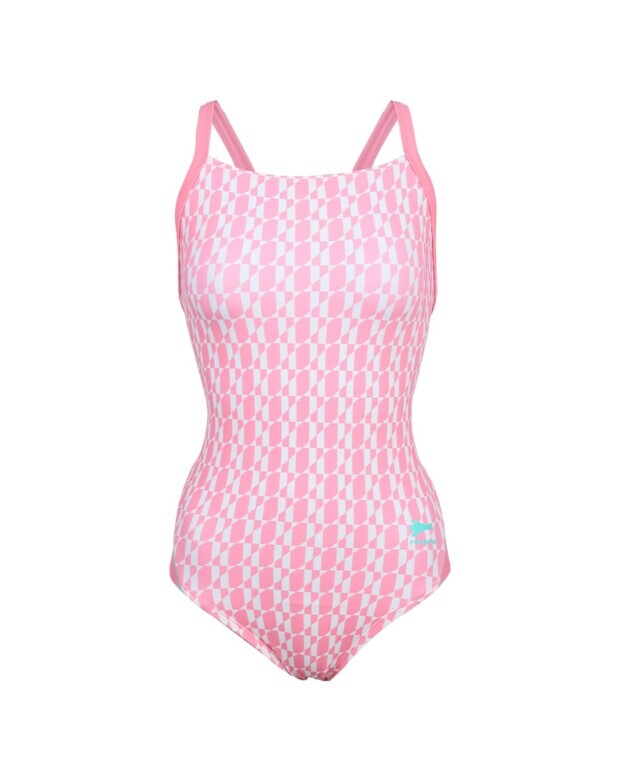 화사한 핑크 컬러와 백 라인이 돋보이며 써포트 프린팅이 체형커버에 도움이 되는  미들컷의 실내 수영복입니다.