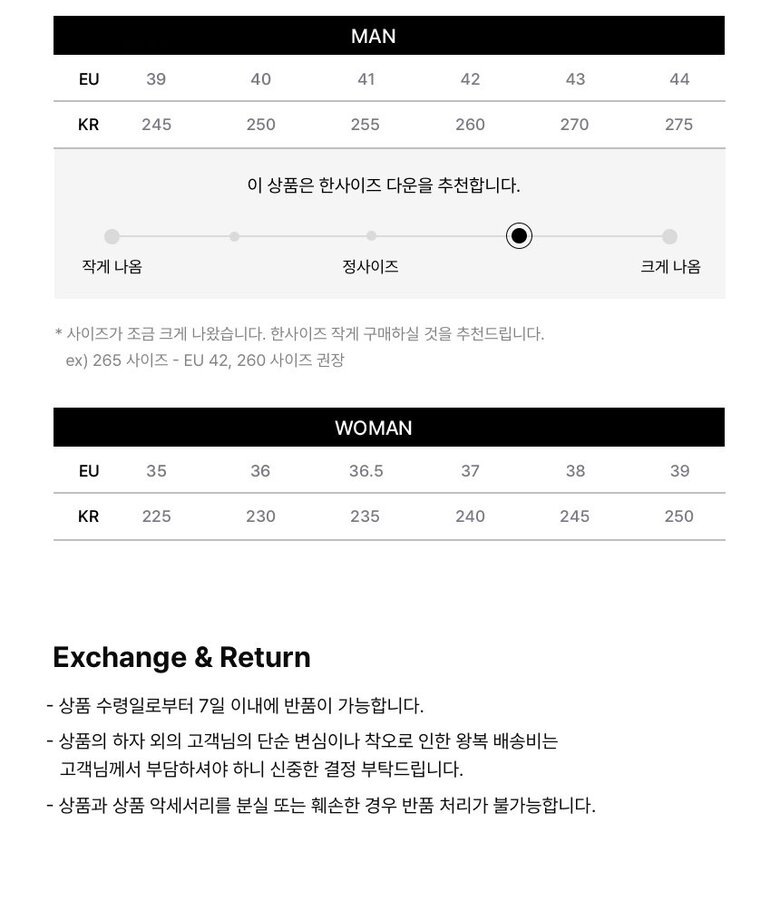 • 처음 배송된 상품상태와 다를 경우(세탁/착용 후 외출하신 경우) 반품이 불가합니다.