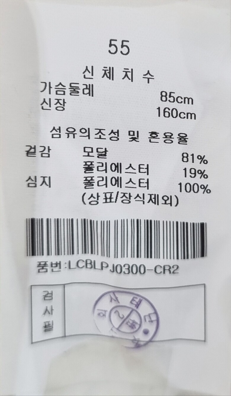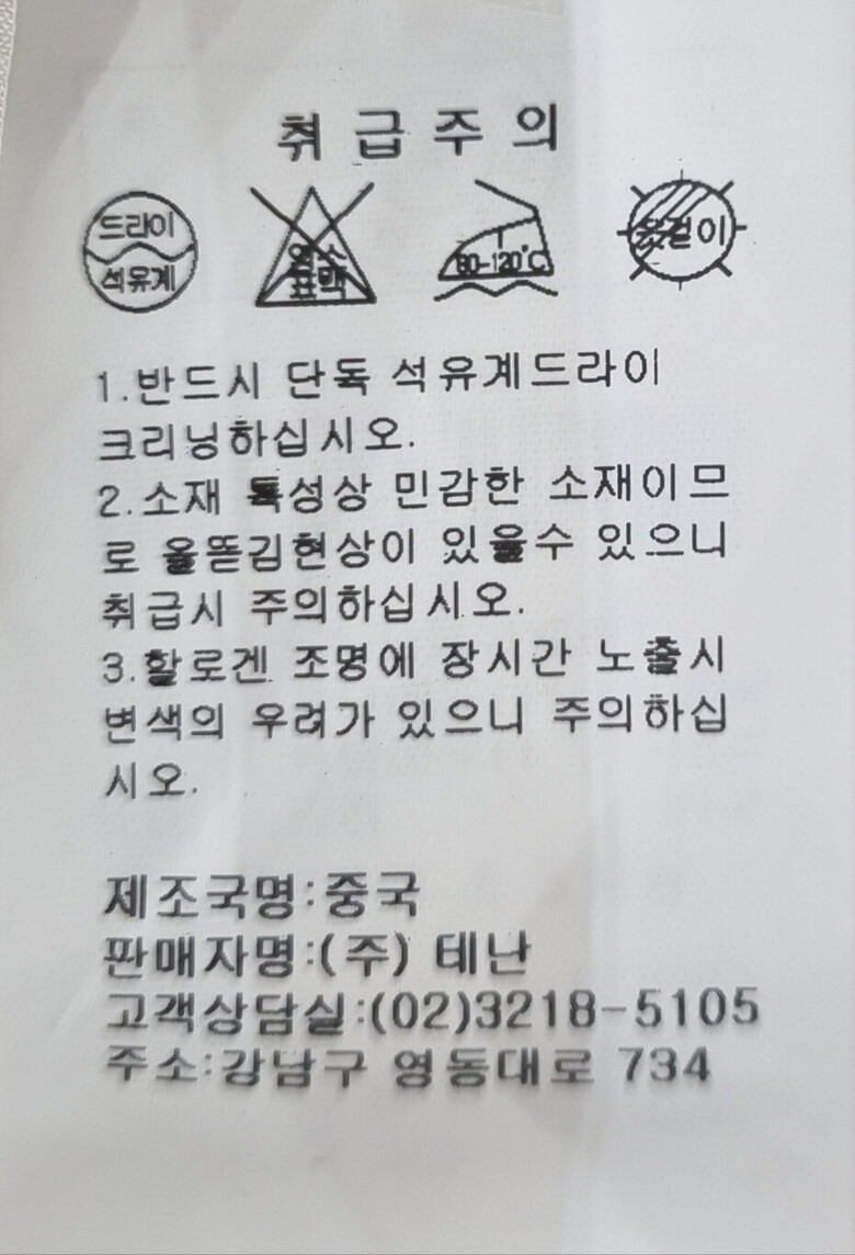 | 6. 세탁방법 및 취급시 주의사항 | 1.반드시 단독 석유계 드라이크리닝하십시오. 2.소재특성상 민감한 소재이므로 올뜯김현상이 있을수 있으니 취급시 주의하십시오. 3.습윤시 마찰에 의한 이염현상에 주의하십시오. |