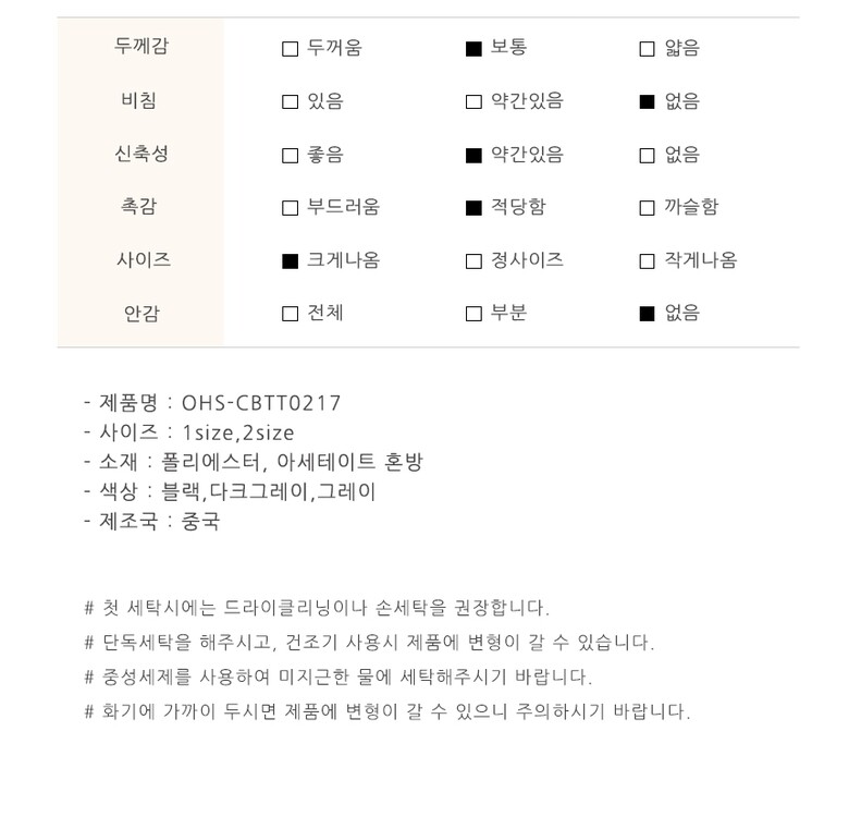 • 처음 배송된 상품상태와 다를 경우(세탁/착용 후 외출하신 경우) 반품이 불가합니다.