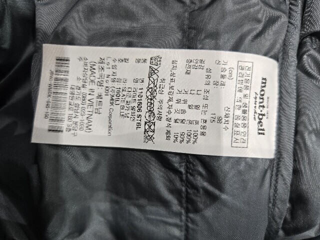 1. 제품 소재 (섬유의 조성 또는 혼용률을 백분율로 표시, 기능성인 경우 성적서 또는 허가서) 겉감 20데니어 바리스틱 나일론 립스톤(발수가공,대전 방지 가공)안감 20데니어 바리스틱 나일론 타프타(대전 방지 가공)충전재 800필 파워EX다운