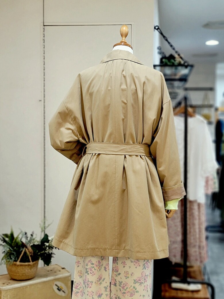 오버한 핏 감의 하프 기장 트렌치코트입니다.