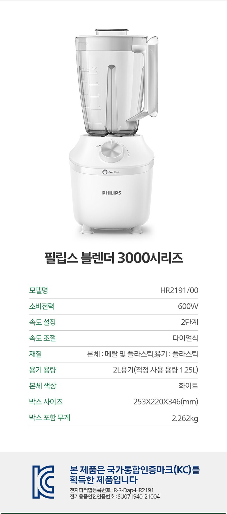 필립스 3000 시리즈 블렌더/믹서기 HR2191/00 화이트