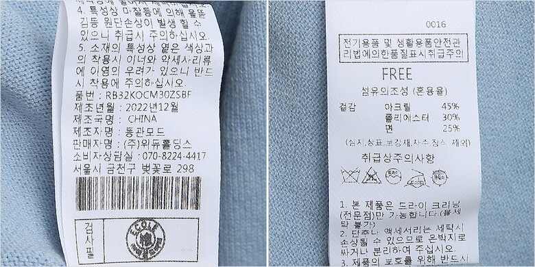 1. 제품 소재 (섬유의 조성 또는 혼용률을 백분율로 표시, 기능성인 경우 성적서 또는 허가서) 겉감-면25% 폴리에스터30% 아크릴45%