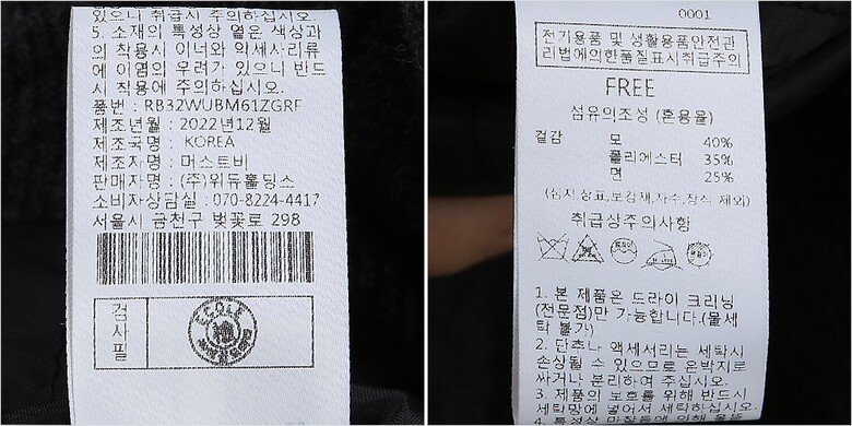 1. 제품 소재 (섬유의 조성 또는 혼용률을 백분율로 표시, 기능성인 경우 성적서 또는 허가서) | 겉감-면25% 폴리에스터35% 모40% |