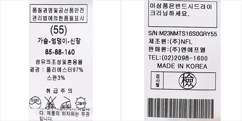 1. 제품 소재 (섬유의 조성 또는 혼용률을 백분율로 표시, 기능성인 경우 성적서 또는 허가서) 겉감-폴리에스터97% 스판3%