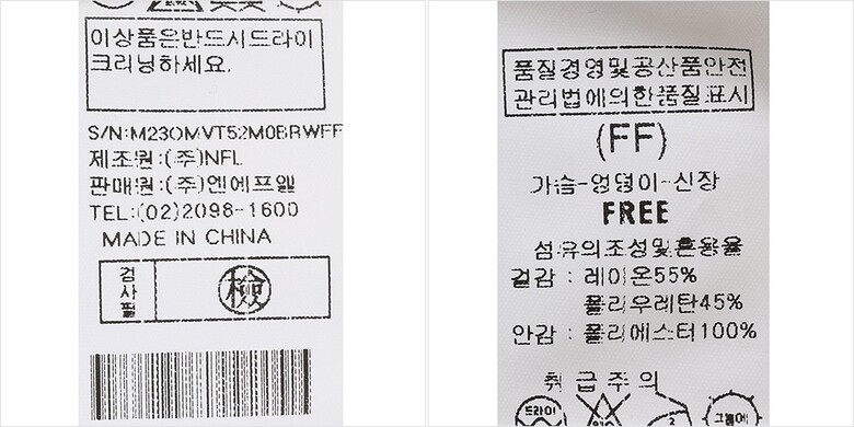 1. 제품 소재 (섬유의 조성 또는 혼용률을 백분율로 표시, 기능성인 경우 성적서 또는 허가서) 겉감-폴리우레탄45% 레이온55% 안감-폴리에스터100%