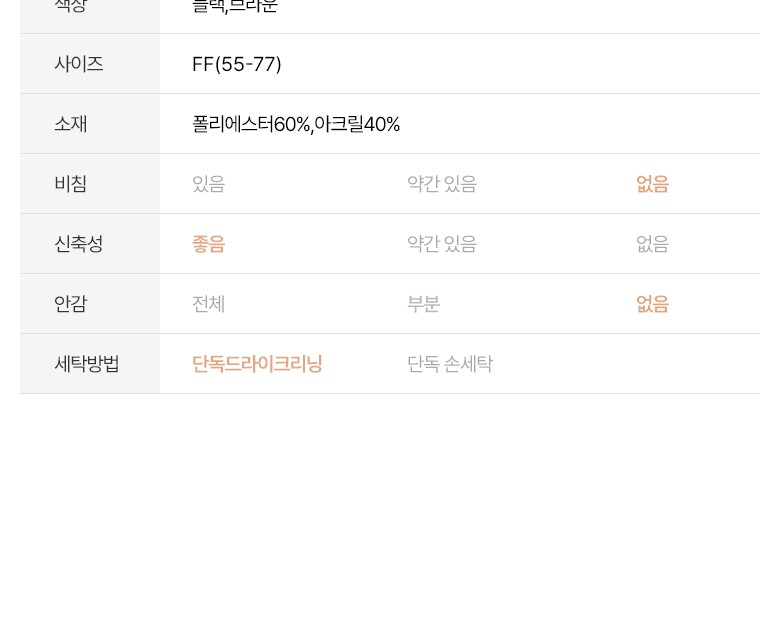1. 제품 소재 (섬유의 조성 또는 혼용률을 백분율로 표시, 기능성인 경우 성적서 또는 허가서) 폴리에스터60%,아크릴40%