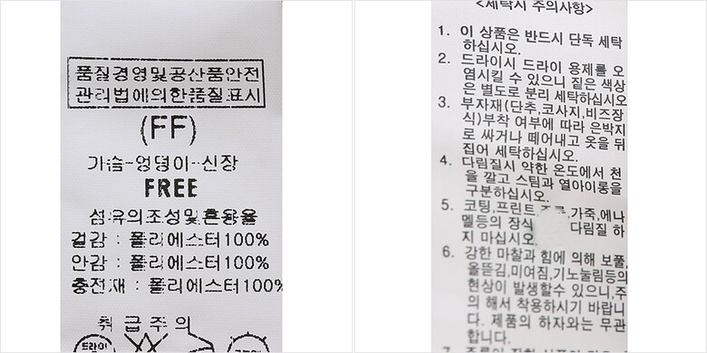 1. 제품 소재 (섬유의 조성 또는 혼용률을 백분율로 표시, 기능성인 경우 성적서 또는 허가서) 겉감-폴리에스터100% 안감-폴리에스터100% 충전재-폴리에스터100%