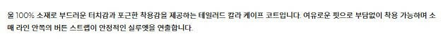 | 1. 제품 소재 (섬유의 조성 또는 혼용률을 백분율로 표시, 기능성인 경우 성적서 또는 허가서) | 상품상세참조 |